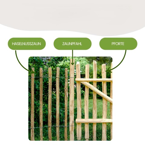 Zur Montage empfehlen wir die passenden Pfähle aus Haselholz – so entsteht ein harmonisches, vollständiges Zaunsystem.