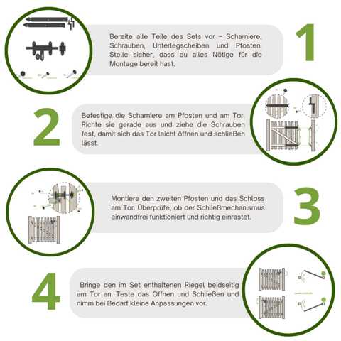 Im Lieferumfang enthalten sind Beschläge, Scharniere, Schloss und Schrauben. Die Zaunpfosten zur Befestigung sind separat erhältlich und können direkt in unserem Shop bestellt werden.