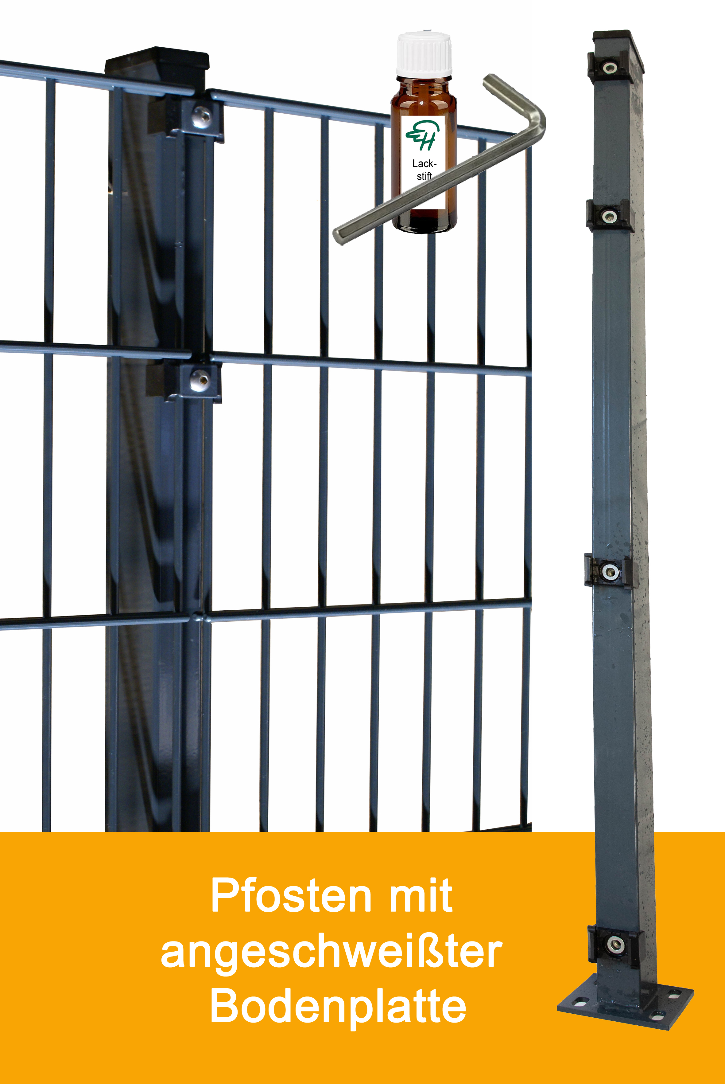 Sie erhalten in diesem Angebot ein Komplett-Set bestehend aus Doppelstabmatten, VA-Befestigungsmaterial und Pfosten mit angeschweißter Bodenplatte.