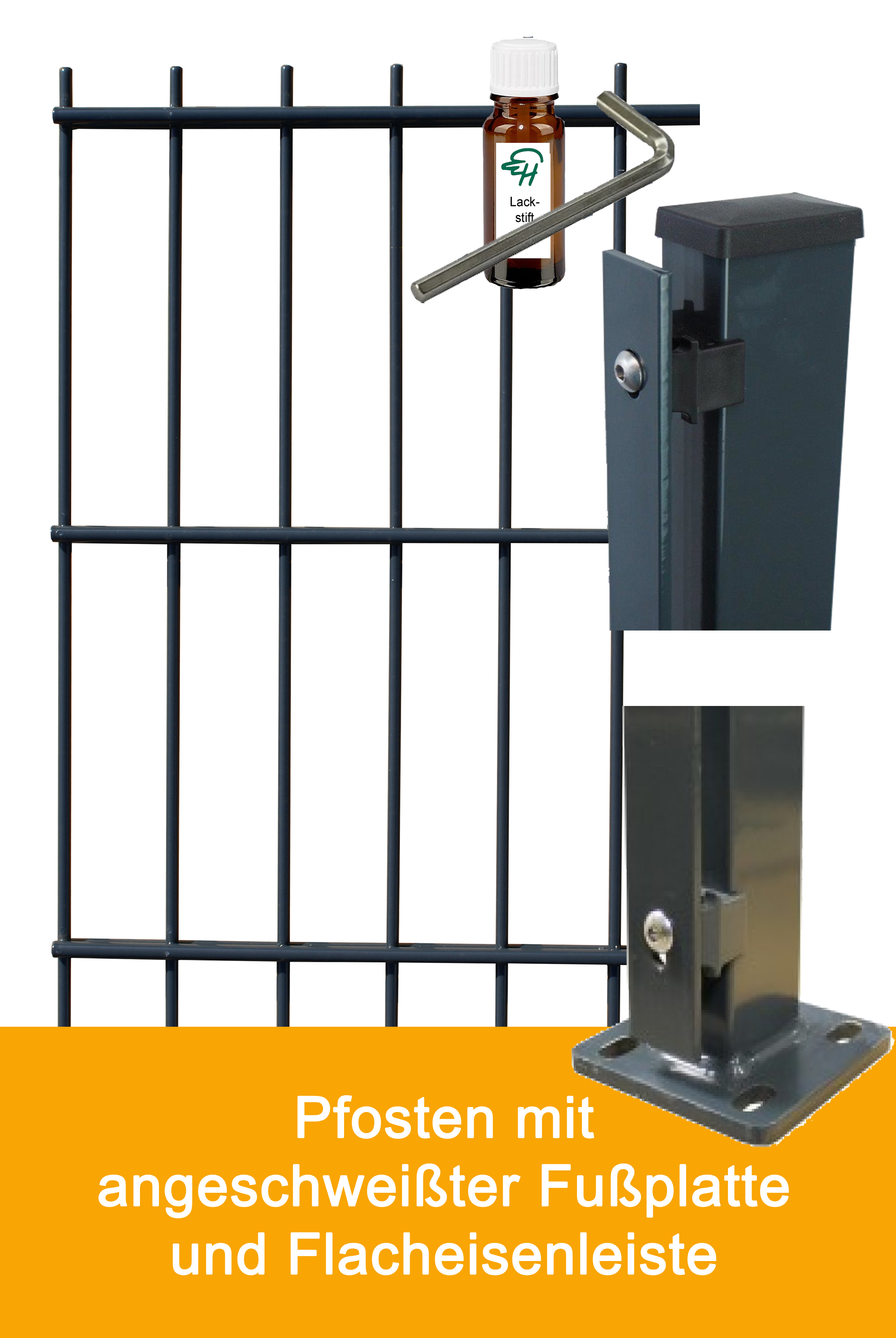 Sie erhalten in diesem Angebot ein Komplett-Set bestehend aus Doppelstabmatten, Abdeckleiste/ Flacheisenleiste, Edelstahlschrauben und Pfosten zum aufdübeln/ mit angeschweißter Bodenplatte.